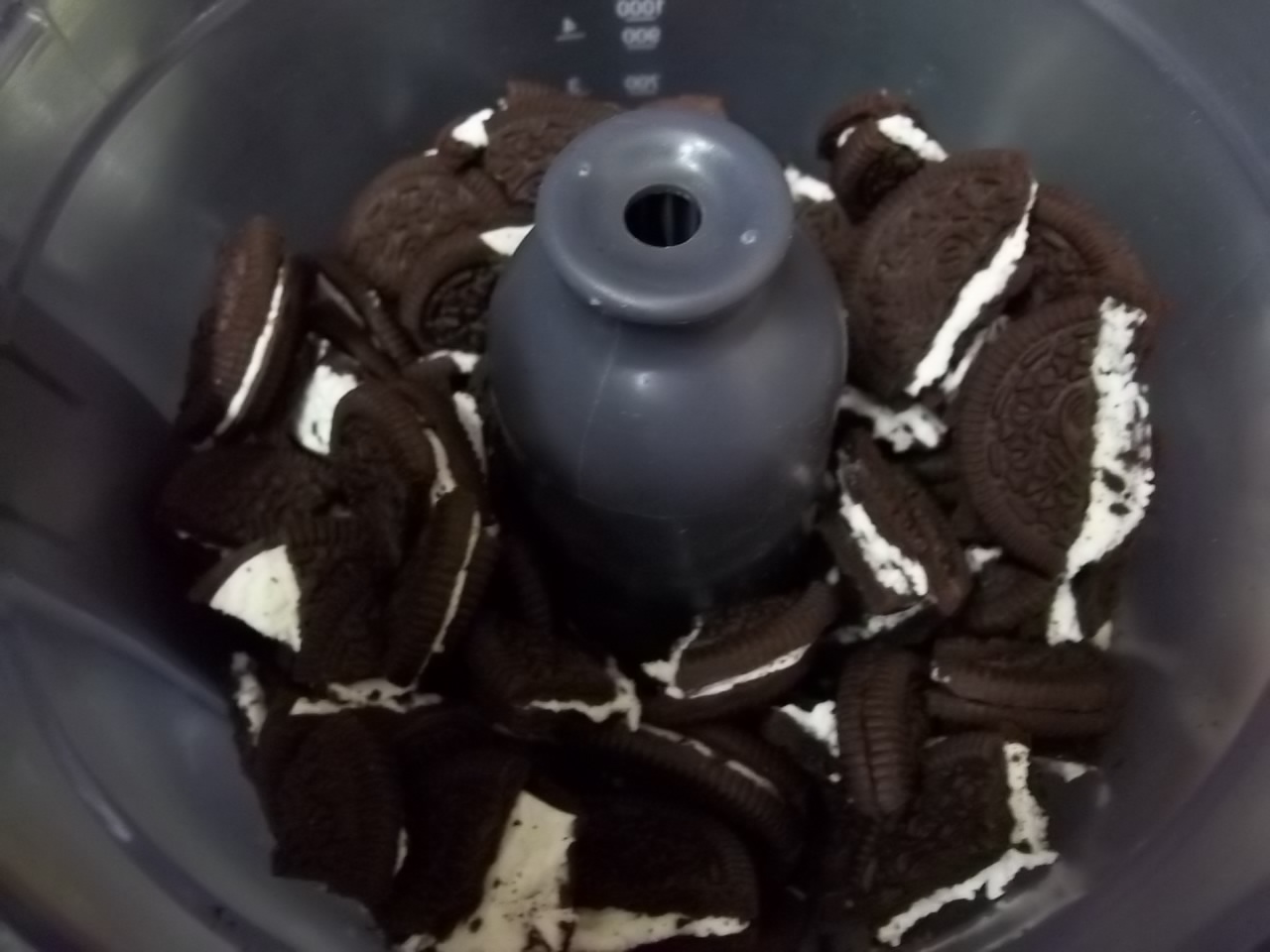 Roughly break oreo cookies and blend to make fine powder. Add melted butter, blend again till incorporated well.